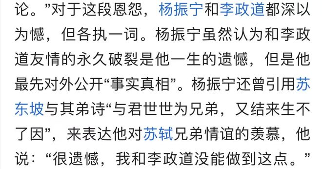 在科学公案史上,杨振宁与李政道的决裂绝对可以说是名列前茅。原因很简单。他们的突破不仅在当时是一个大新闻,而且深刻影响了此后我们国内科学的发展。那么这两个人从争吵到关系破裂的过程中,谁该负责,或者说谁的责任更大呢?这是杨振宁还是李政道?对于这个问题,网友们终于明确了答案。且不说这是最终的答案,至少是一个相当客观的答案。事实上,到了晚年,杨振宁终于感到遗憾,引用苏东坡的诗来抒发自己的感情。李政道也认为两人的决裂是一个巨大的悲剧。李真因为董事长的一句话而去了美国。李政道去美国后,杨振宁帮他找了房子,两人成了很好的朋友s。但因为一件小事,李政道觉得杨振宁太聪明,圆圆善于算计,在他心里埋下了一根刺。此后,杨振宁的聪明才智也体现在试卷的签名顺序上。他想要排在李正道前面。原因是他比李大四岁,必须遵循儒家传统。这件事让两个人心里的裂痕越来越大。第二次,李政道按照国际惯例来了。在这个过程中,杨振宁的第一任妻子杜致礼出现了枕头危机。这也是他第一次在那里休息。后来两人因为一篇文章走到了一起。这是他们对学术最热情的时候。在这样的良性循环中,我终于有了一篇诺奖获奖论文。当他们终于获得诺贝尔奖,即将领奖时,杨振宁的妻子杜致丽提出了新的要求,这已经算是他们第二次暗恋对方了。杨振宁夫人与李政道找不到突破口,便去向李夫人求情,最后对方同意了。争夺的种子一旦种下,往往就会结出果实,李政道和杨振宁也不例外。这时候还是版权排名的问题。这时,杜致礼第三次向杨振宁吹响了口哨,杨振宁又跟了上去。面对杨振宁的要求,李政道不想再忍下去,决定停止合作。外界发现此事,建议杨振宁去看心理医生。这样的破裂极大地影响了我们国内物理学的发展方向。李政道也被杨氏扣为国家失权、耻辱的标签。就连笔者也觉得不可思议。网友总结两人争议焦点在于一个是焦点d 侧重于基础,另一个侧重于应用。不过,即便如此,杨振宁当时的反应也太强烈了,更别说称自己的老友失权、侮辱国家了。看完这个过程,网友纷纷感叹李政道夫人是个绅士,没有你杨振宁那么犀利。有网友对两者的对比进行了评论。然而杨振宁年轻的时候,他的聪明才智其实是写在脸上的。相比之下,李政道却是一脸正气。一是聪明,一是认真诚实,指的是不同的做事态度和方式。虽然他们注定要在一起一段时间,但最终他们在关键时刻做出了不同的人生选择,最终分手。可以说,即使李宗道和杨振宁的决裂令后人悲痛,但从他们自己的角度来看,这仍然是一个注定的结果,因为两人他们本来就不是同一个人,更何况他们身边还有人一次又一次地吹枕头。最终,友谊无法挽回,他们在晚年也为此后悔不已。正是:夫人三下枕套,杨幂勇就分开了。